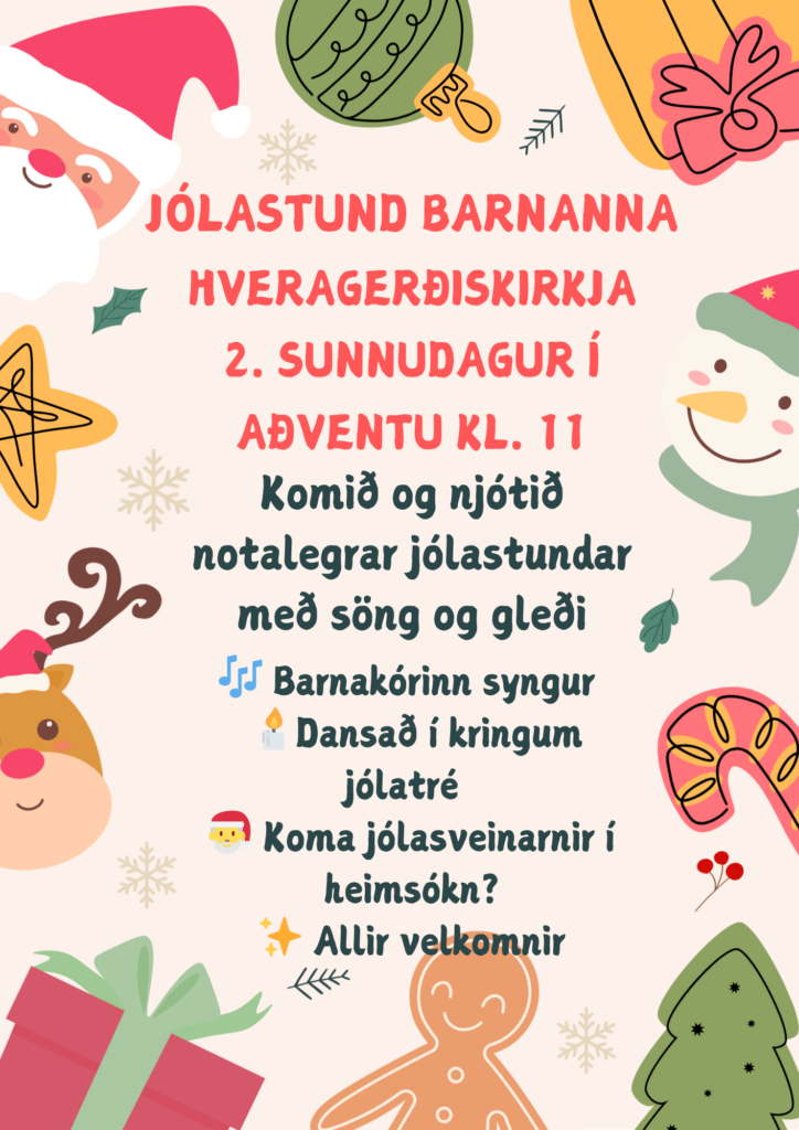 Verið velkomin í jólastund barnanna í Hveragerðiskirkju 2. sunnudag í aðventu. Barnakórinn syngur. Aðventukransinn tendraður. Jólasaga. Dansað í kringum jólatréð. Og ef börnin eru stillt þá koma jólasveinarnir 🙂